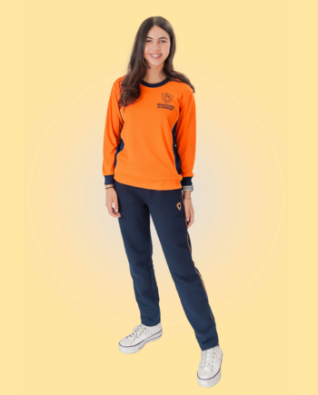 Delantal niña, de popelina, azul con naranjo y con logo bordado. Uso diario uniforme desde Play Group a Kinder. Tallas desde la 2 a la 8.